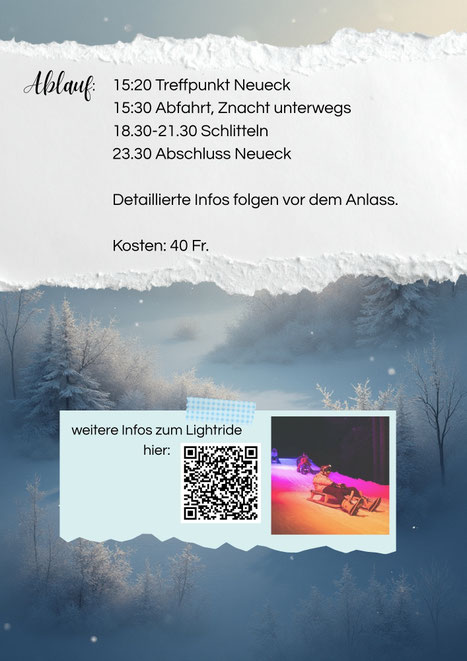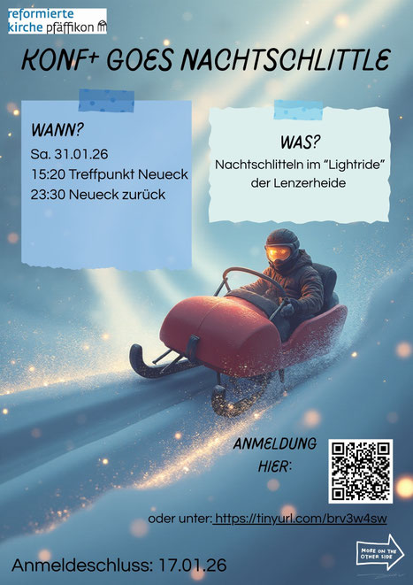 Wolltest du schon immer einmal nachts schlitteln gehen? Dann ist dieser Anlass deine Chance. Zusammen mit dem Konf+ gehen wir am 31.01.26 in der Lenzerheide den