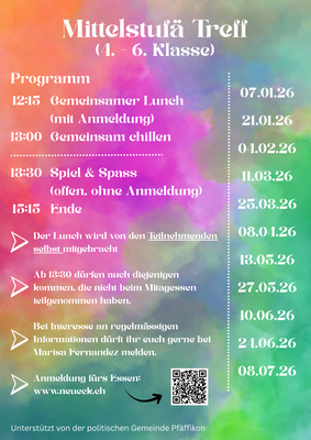 Der Mittelstufä Treff ist ein Angebot, für alle Kinder aus Pfäffikon ZH, welche in der Mittelstufe sind.